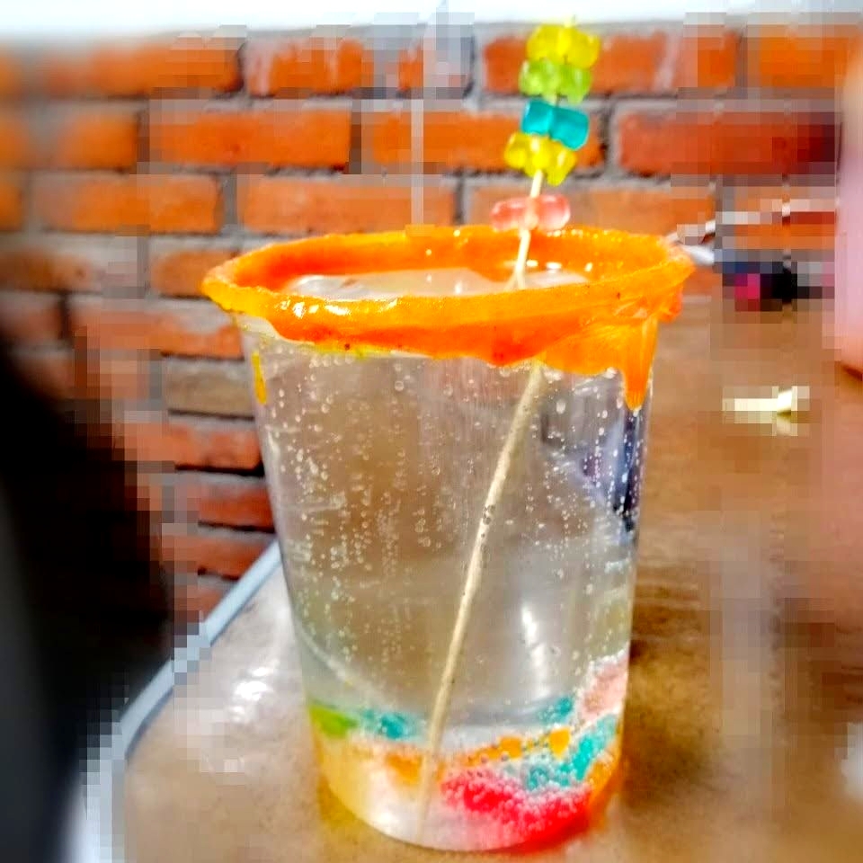 Vodka con soda de limon y gomitas de panditas dentro, escarchada con chamoy