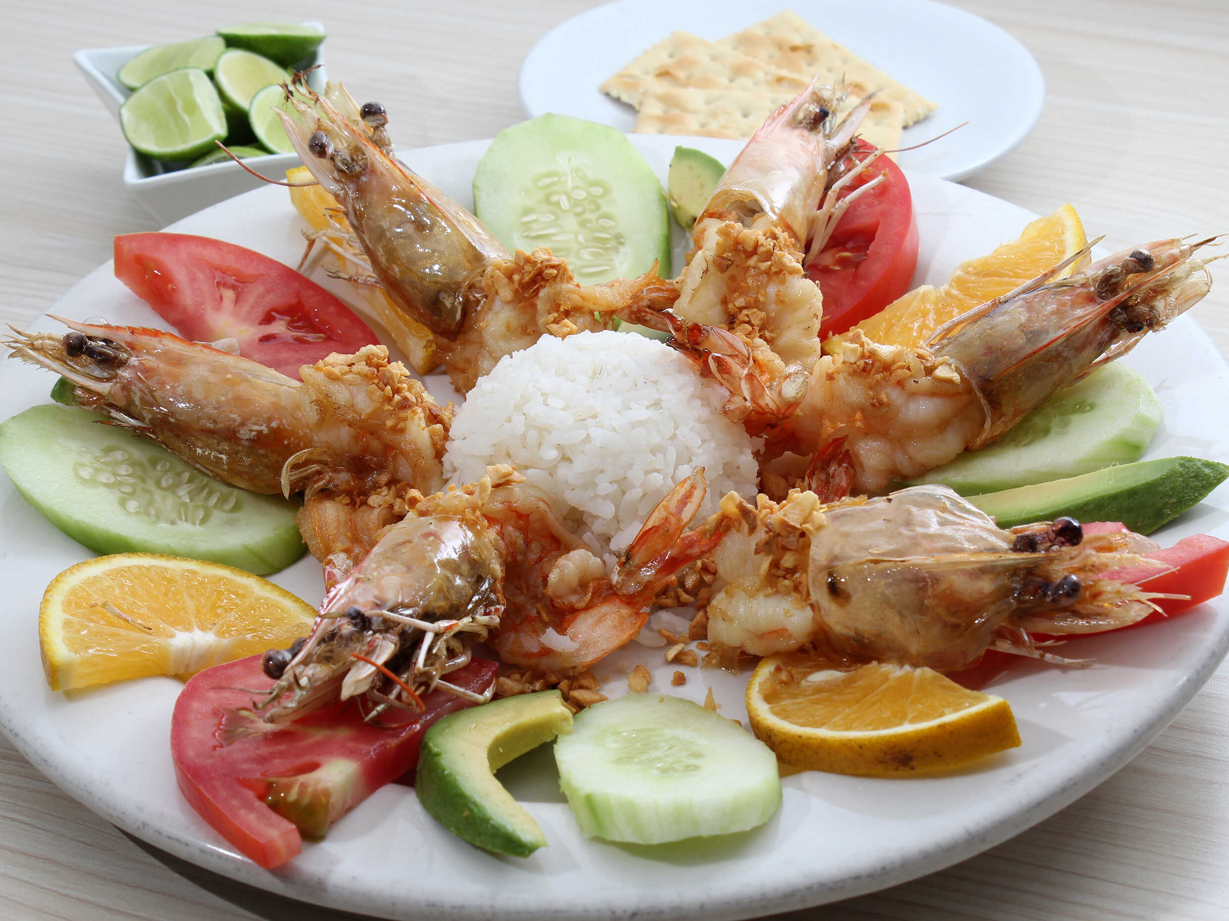 Arroz (300 grs.), pacotilla (180 grs.), 2 camarones con cabeza (20 grs. c/u).