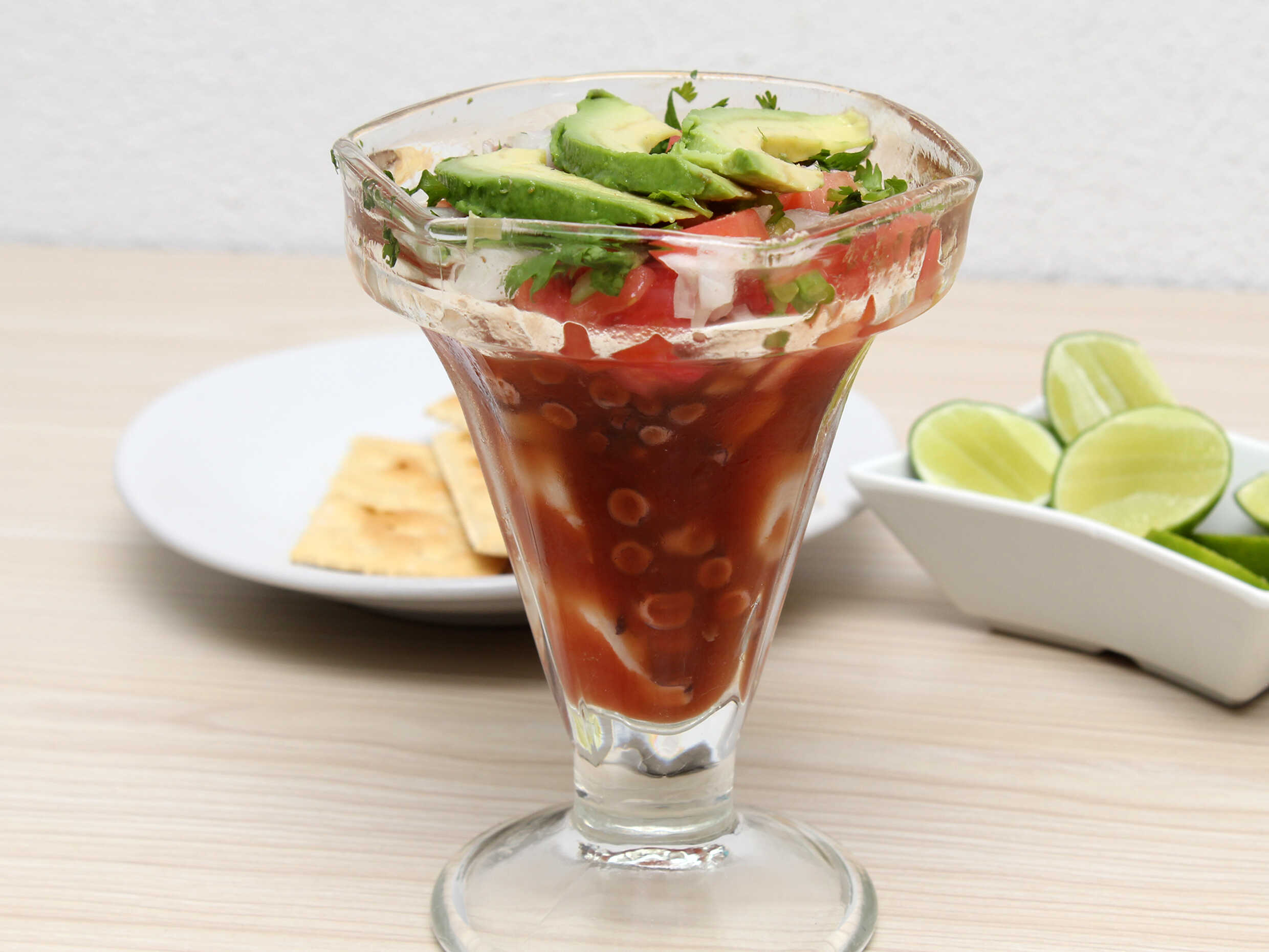 Refrescante bebida con base de clamato, cerveza, ostión, camarón pacotilla, salsas y pepino.