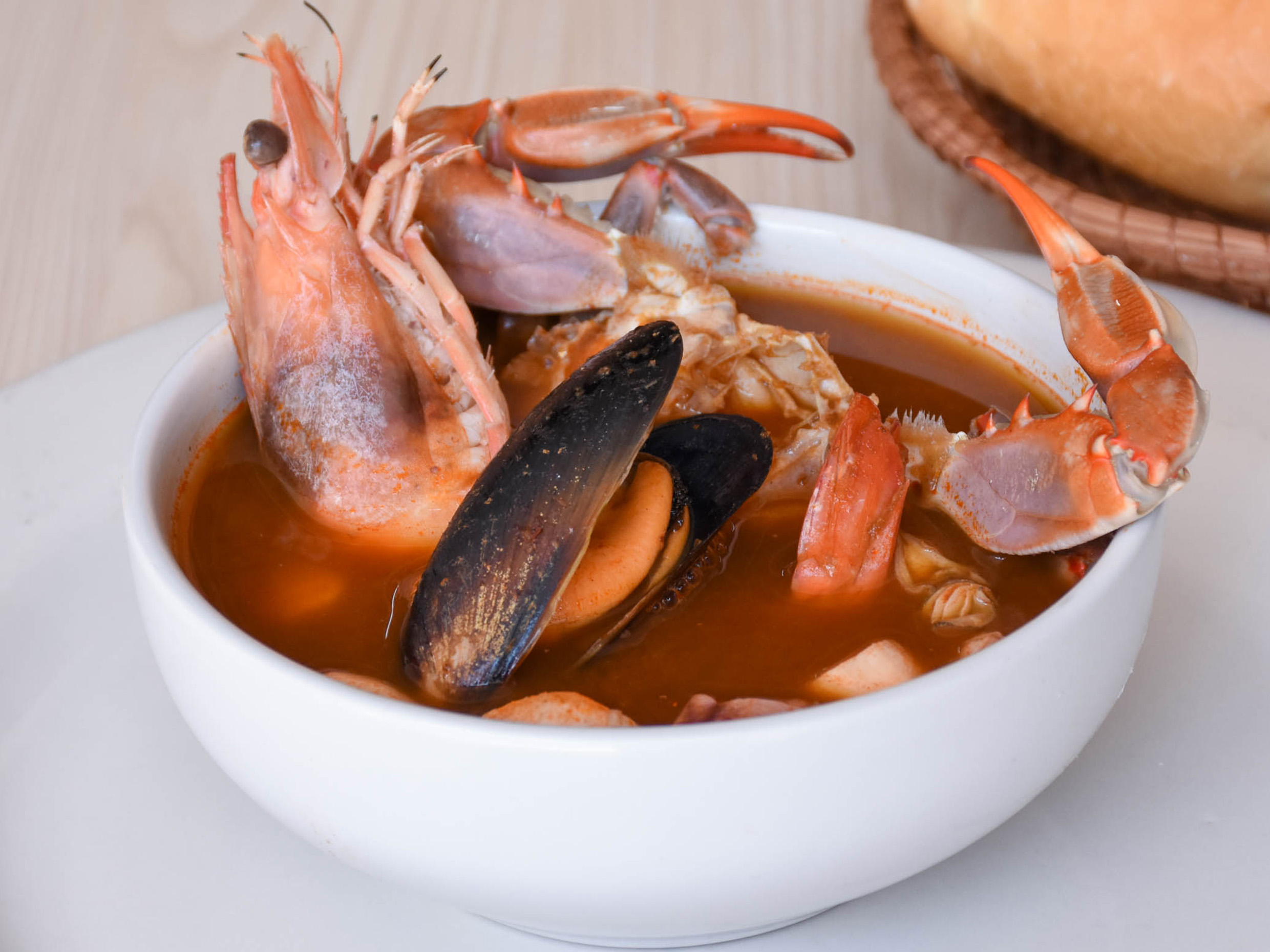 300 ml de caldo picosito con pulpo, callo, calamar, ostión, pacotilla, jaiba concha, mejillón y camarón grande con cabeza.