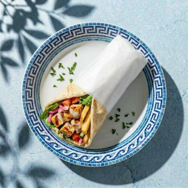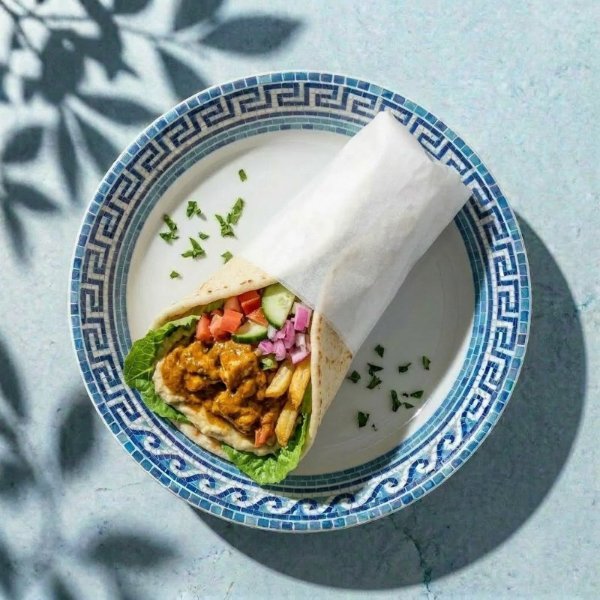 Pan pita,lechuga, pollo, hummus de garbanzo, papas fritas, jitomate, pepino, cebolla morada y vinagreta libanesa. Incluye Salsa Peri Peri por separado.