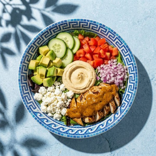 Bowl con base de arroz integral, mezcla de lechugas, pollo con salsa periperi, hummus de garbanzo, jitomate, pepino,cebolla morada, brocoli aguacate y queso de cabra. Vinagreta: Libanesa.
