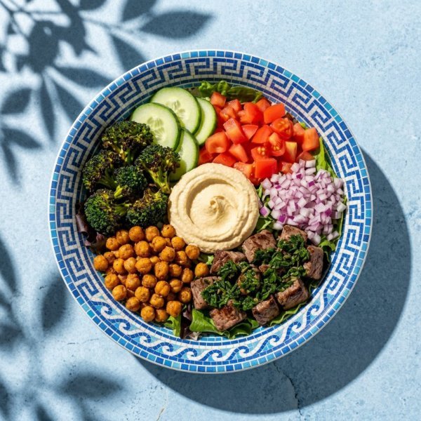 Bowl con base de arroz integral, mezcla de lechugas, arrachera con chimichurri, hummus de garbanzo, jitomate, pepino,cebolla morada, brocoli rostizado y garbanzos crujientes. Vinagreta: Libanesa.