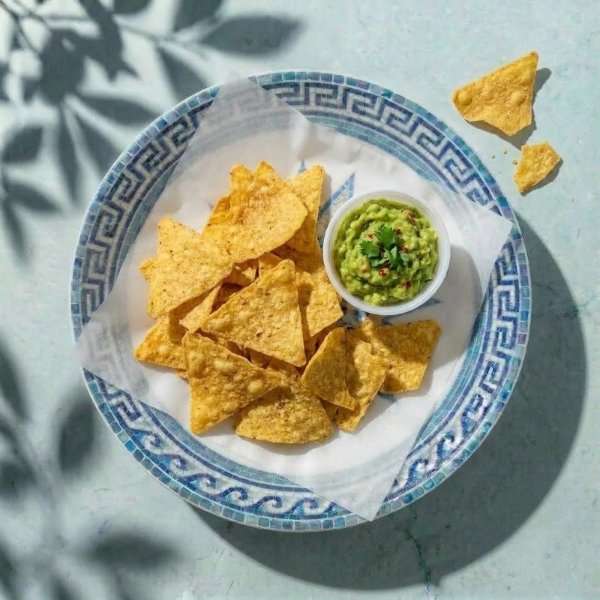 Disfruta una porción de totopos de maíz con guacamole hecho con aguacate, pico de gallo, sal, limón y pimienta (280 gr).
