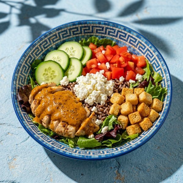 Bowl con base de arroz integral, mezcla de lechugas, pollo,dip de berenjena, hummus de garbanzo, jitomate, crutones y queso de cabra. Vinagreta: Libanesa.
