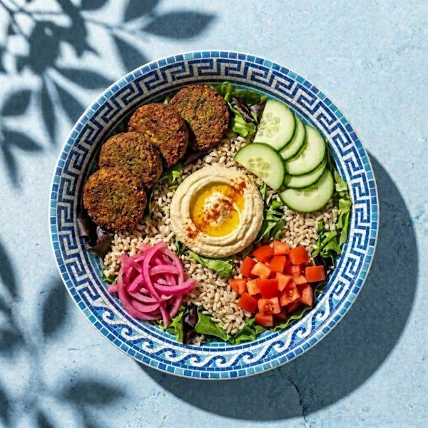 Bowl con base de arroz integral, mezcla de lechugas, Falafel (5), hummus de garbanzo, jitomate, pepino,y cebolla encurtida Vinagreta: Libanesa.
