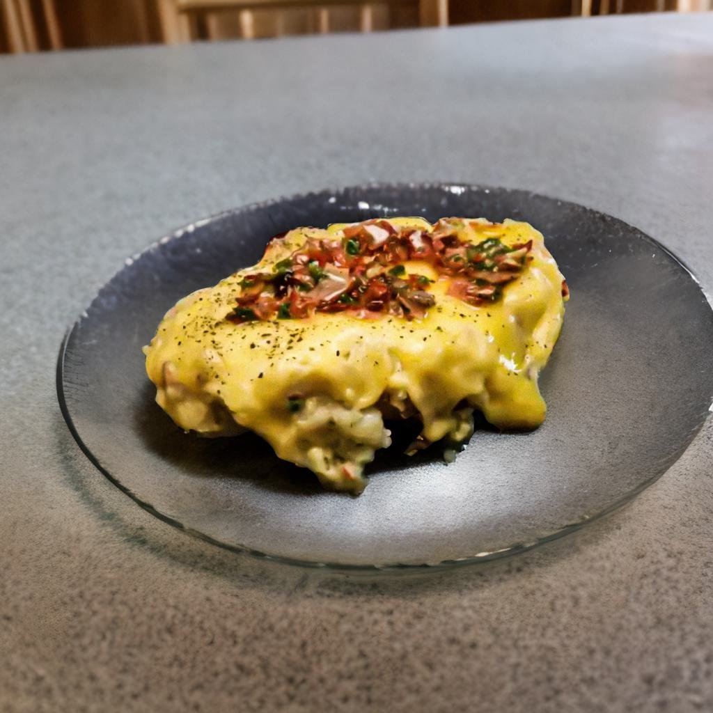 Papa salpimentada rellena de trocitos de tocino, chilito y mozzarella, gratinada con queso y bañada con salsa.