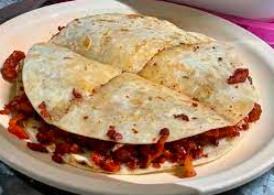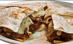 Tortilla de harina, Frijoles, Pechuga a la plancha, Queso mozzarella, pimiento morrón, Acompañado de papas.