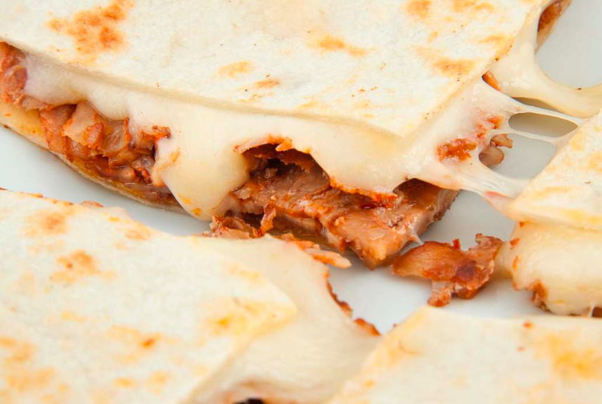 Tortilla de harina, carne al pastor y queso oaxaca.