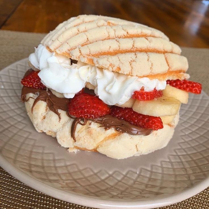 Platano Macho, Leche condensada, Crema, Mermelada de fresa, Chispas de chocolate