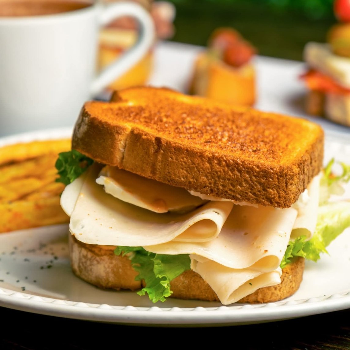 190g Pechuga de pavo, queso manchego o panela, lechuga, jitomate y cebolla. Guarnición de ensalada o chips