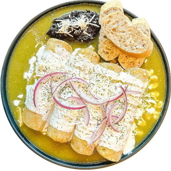 4 piezas de Enchiladas Suizas. Con crema, queso fresco y cebolla. Elige el relleno .