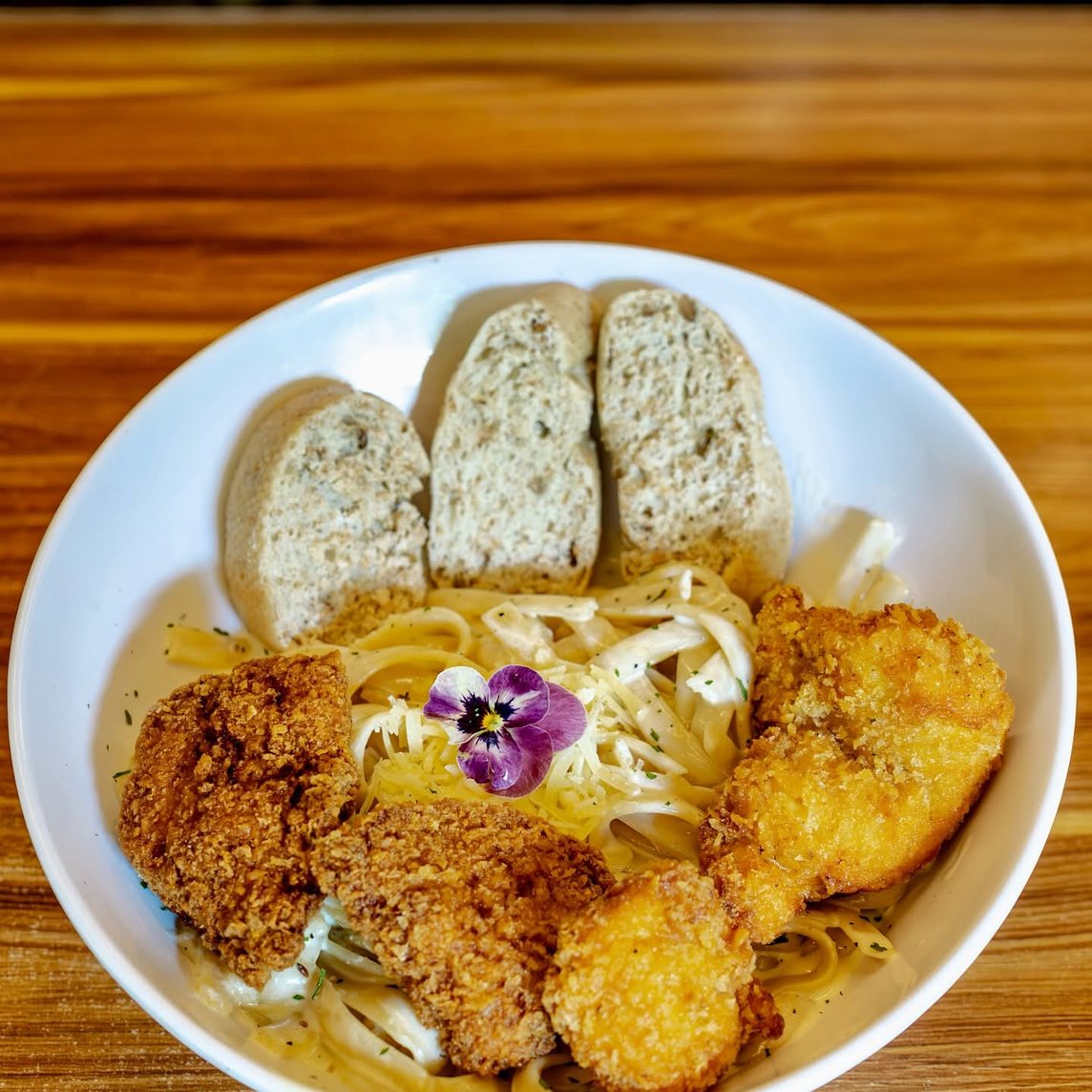 Pollo empanizado con fetuccini a la crema.