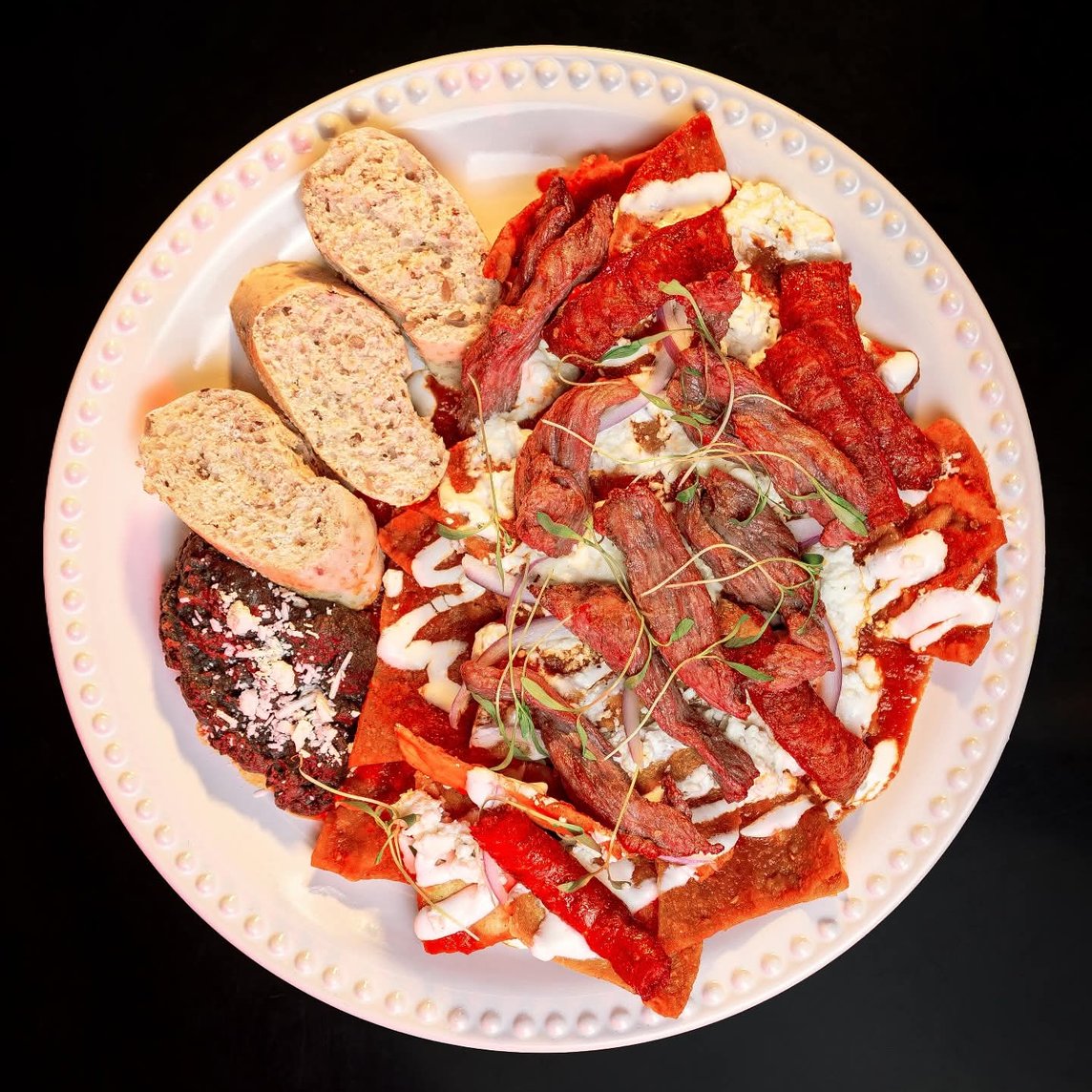 Chilaquiles de la casa. Con arrachera, chistorra y queso de cabra.