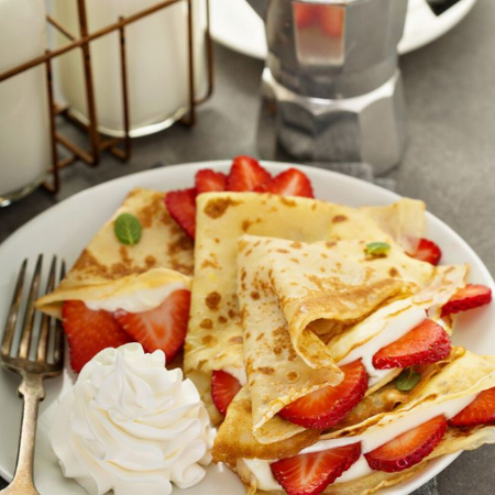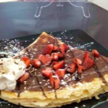 Deliciosa crepa de queso philadelphia con mermelada de fresa, cubierta con salsa de chocolate ó fresa y azúcar glass.