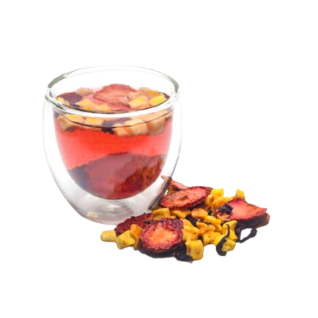 Exquisita tisana fresa kiwi con trozos de frutas deshidratadas, puede ser fría o caliente.