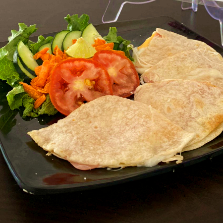 Deliciosos molletes con una cama de frijoles, jamón de pavo, queso Oaxaca y pico de gallo. Guarnición de pepino y zanahoria o fresa y plátano.
