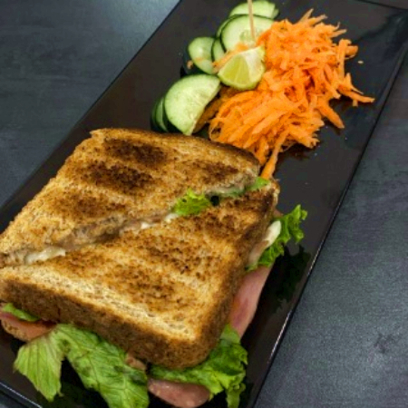Crujiente sándwich de jamón de pavo con queso panela, lechuga, jitomate, frijoles y rajas o chipotle. Guarnición de zanahoria y pepino o fresa y plátano.