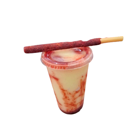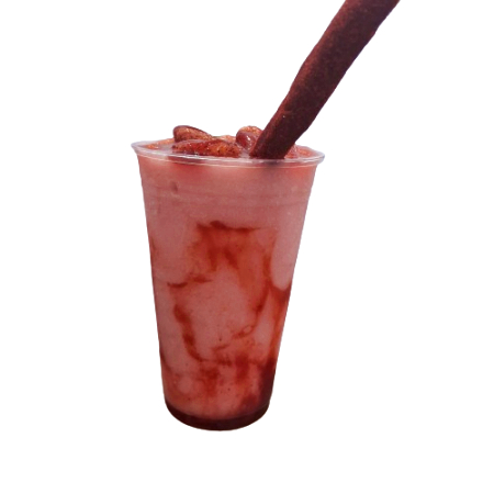 Bebida refrescante con pulpa de fresa acompañado con miguelito y chamoy.