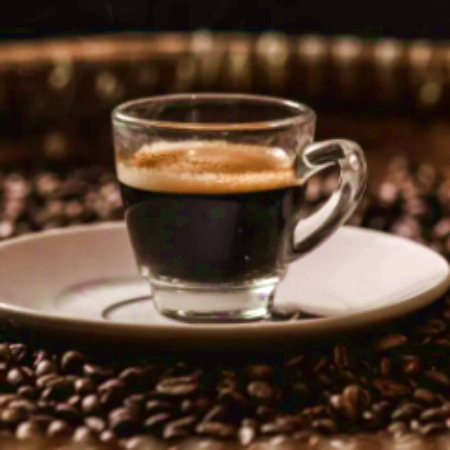 Latte shot de café con leche al vapor, con una fina capa de leche espumosa.