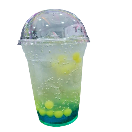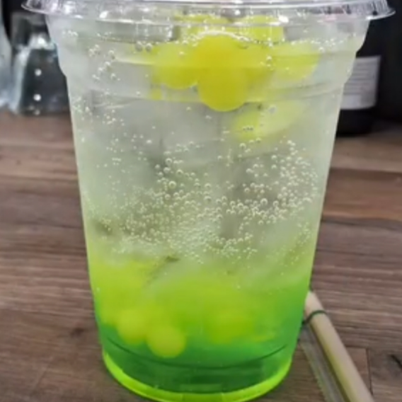 Refrescante bebida a base de agua mineral con saborizante de manzana verde y perlas moleculares.