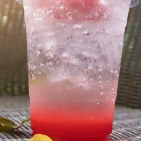 Refrescante bebida a base de agua mineral con saborizante de fresa y perlas moleculares.