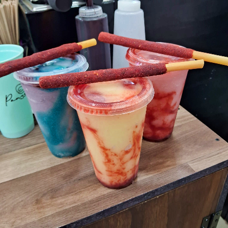 Bebida refrescante con pulpa de mora azul acompañado con miguelito y chamoy.