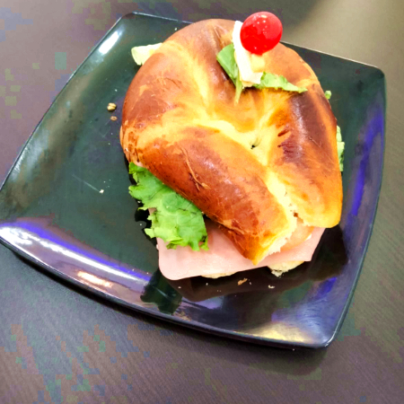 Delicioso cuernito con jamón, queso amarillo, queso panela y lechuga.