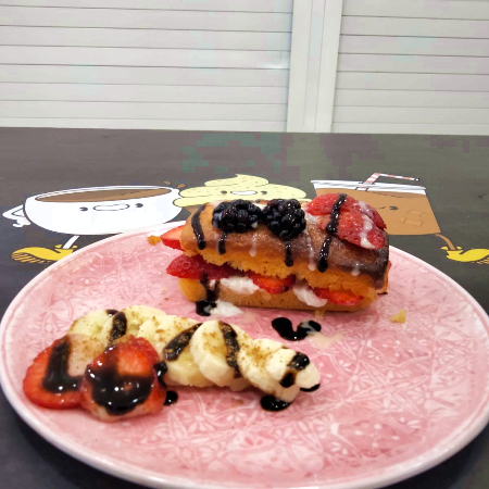 Pan de elote. Relleno de crema batida con fresas. Bañado con lechera y chocolate con una cama de plátano y pizca de canela.