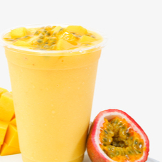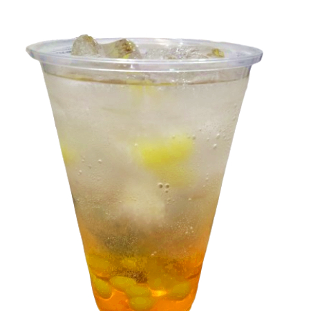 Refrescante bebida a base de agua mineral con saborizante de maracuyá y perlas moleculares.