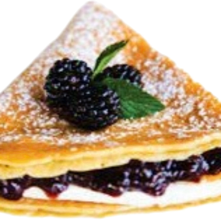 Deliciosa crepa de queso philadelphia con mermelada de zarzamora, cubierta con salsa de fresa y azúcar glass.