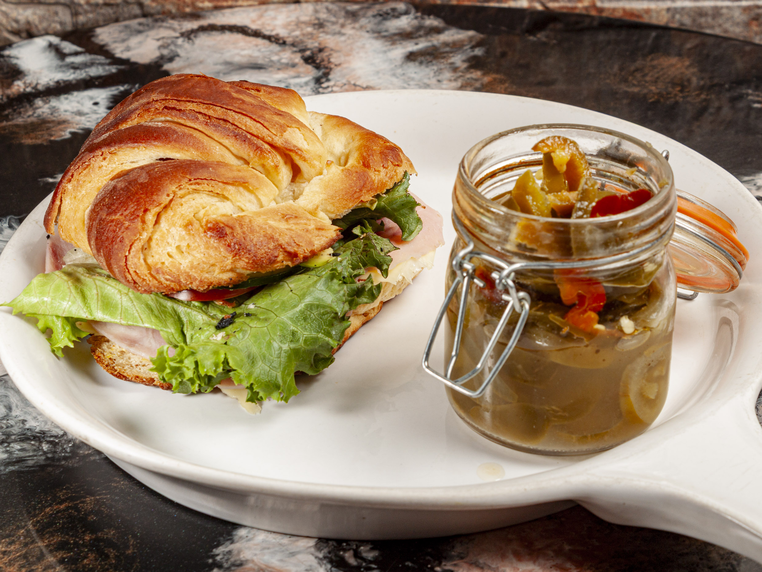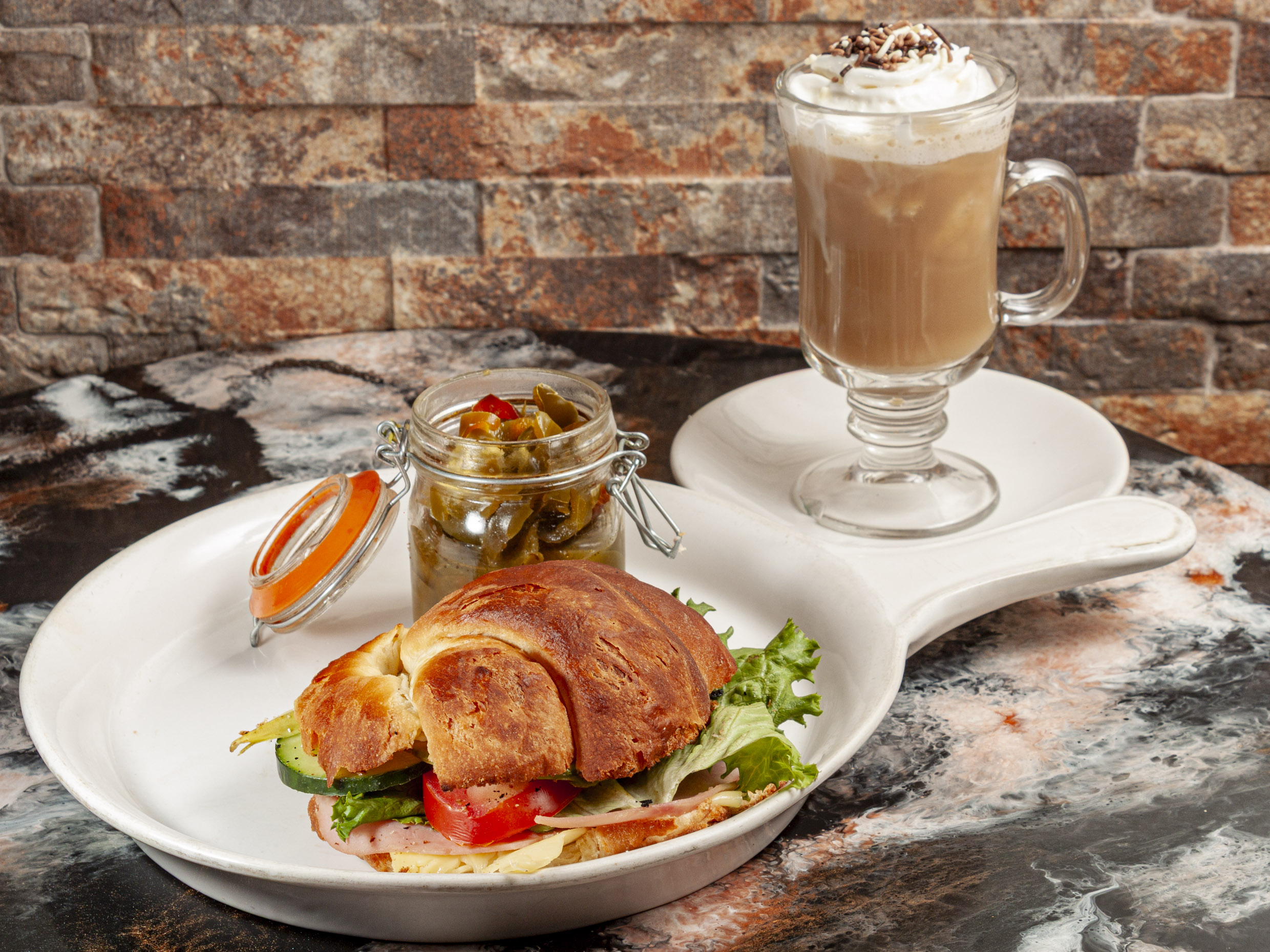 Capuchino de 8 oz., coissant de jamón con queso, lechuga, jitomate, pepino y aguacate.