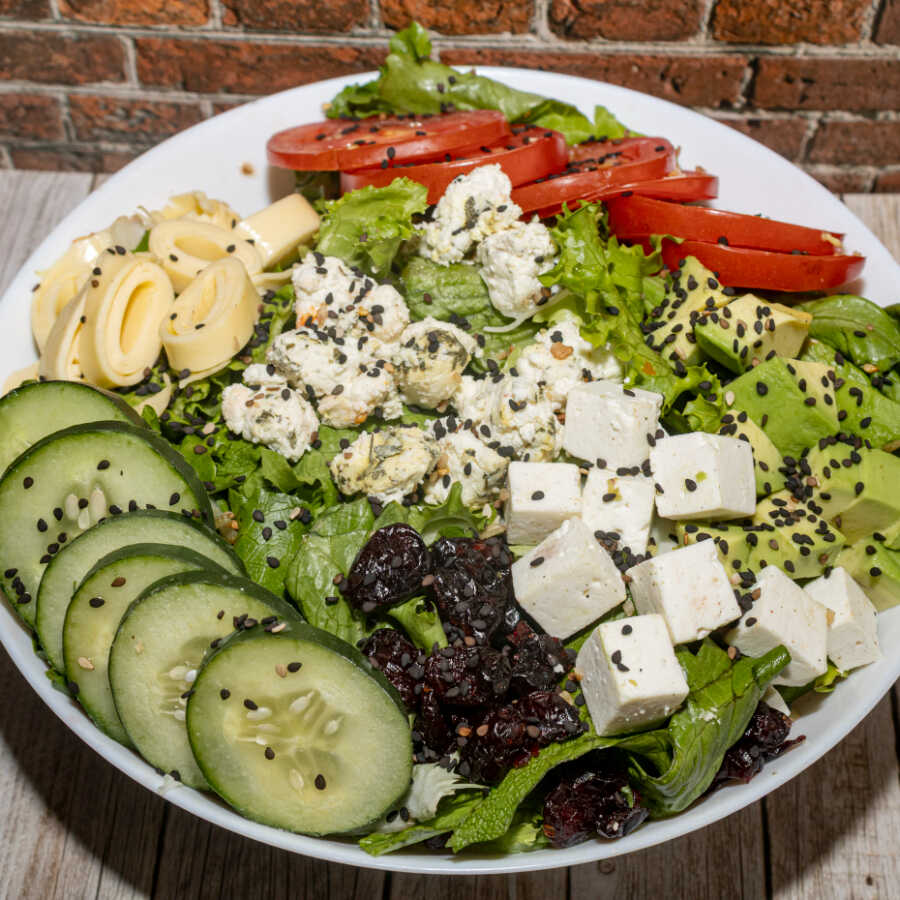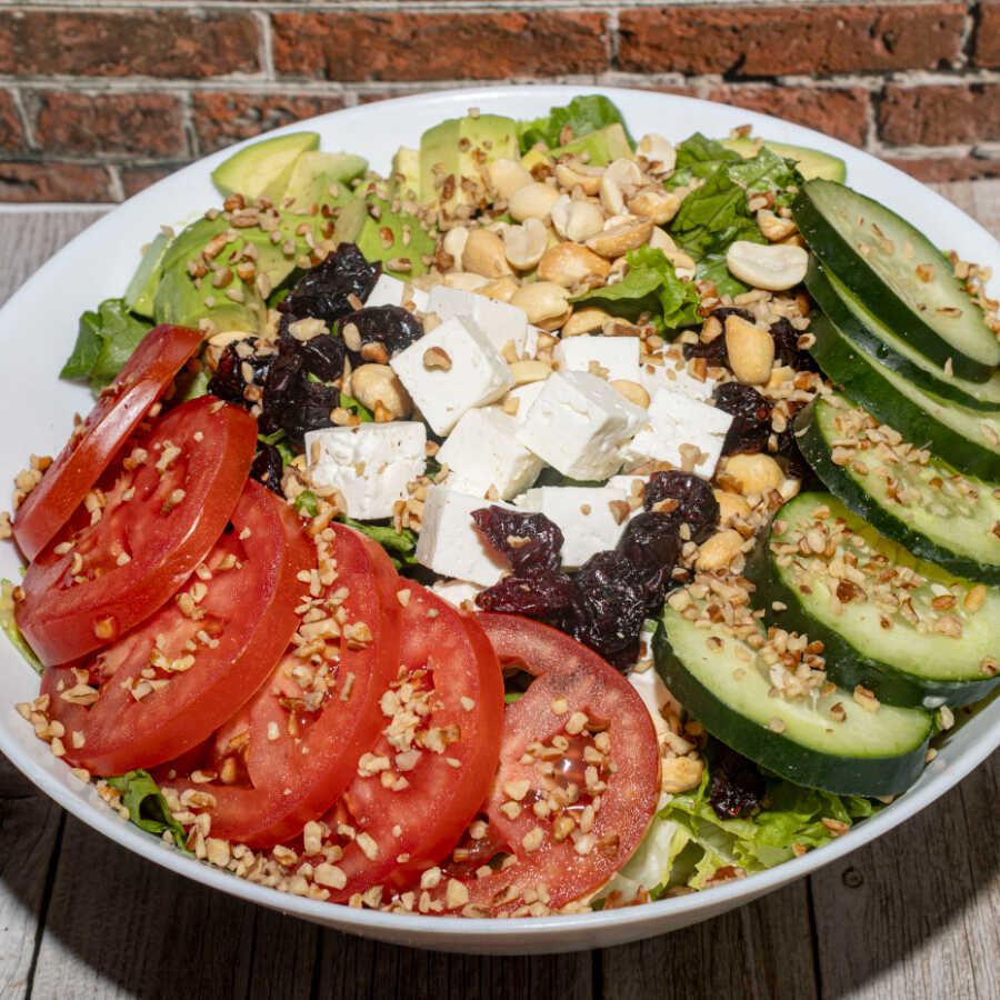 Lechuga, aguacate, queso panela, nuez, cacahuate, arándano, pepino y jitomate