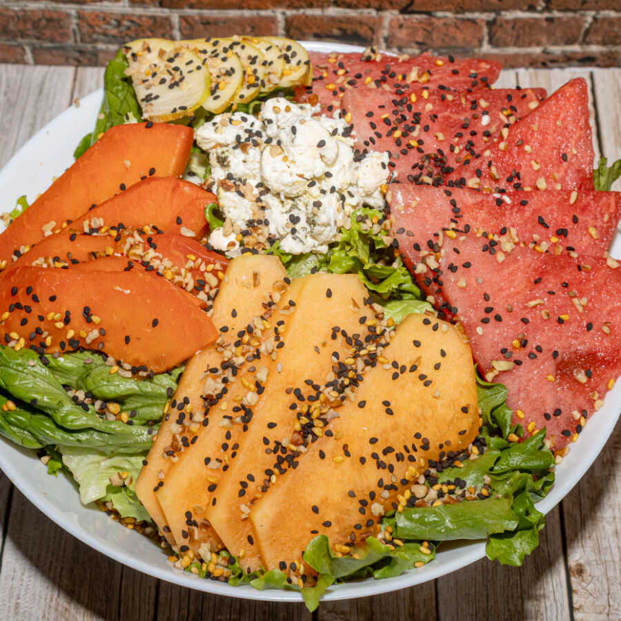 Frutas de temporada, queso de cabra, lechuga, espinaca, nuez, ajonjolí