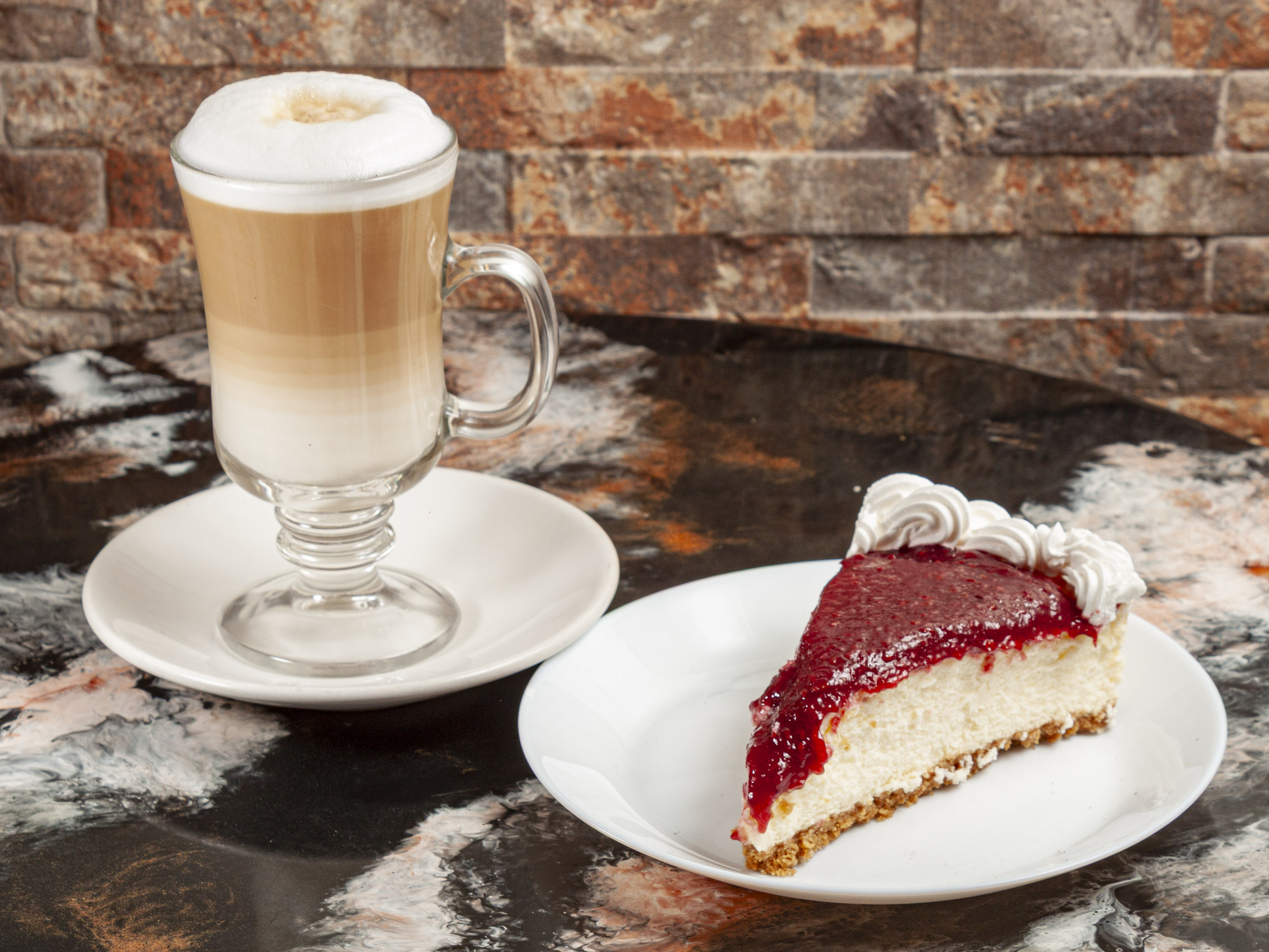 Capuchino de 8 oz., cheesecake de zarzamora, chessecake garabatos, chocolate, baklava.