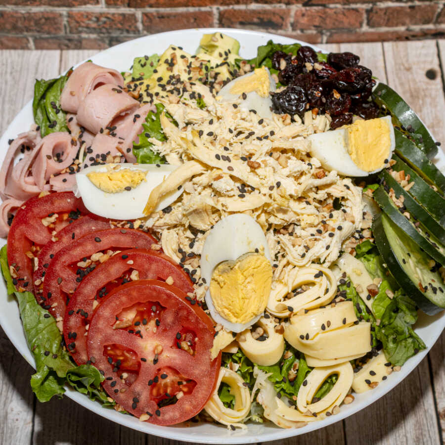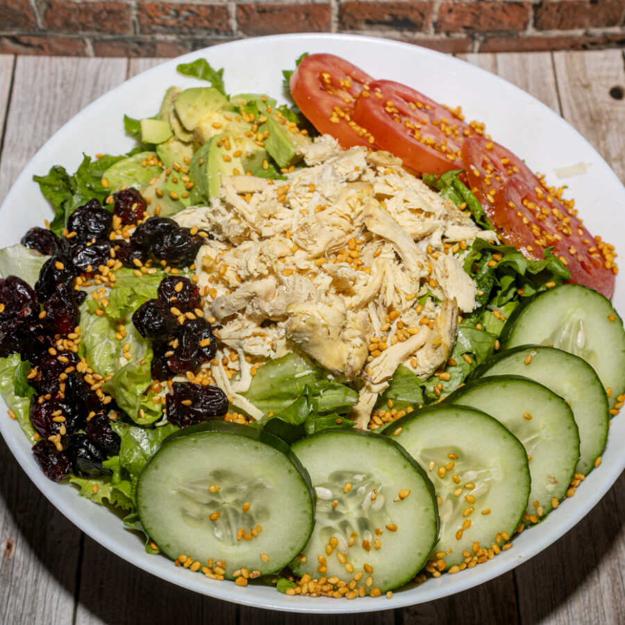 Lechuga, aguacate, jitomate, manchego, pollo, jamón, huevo, arándano, ajonjolí nuez con aderezo