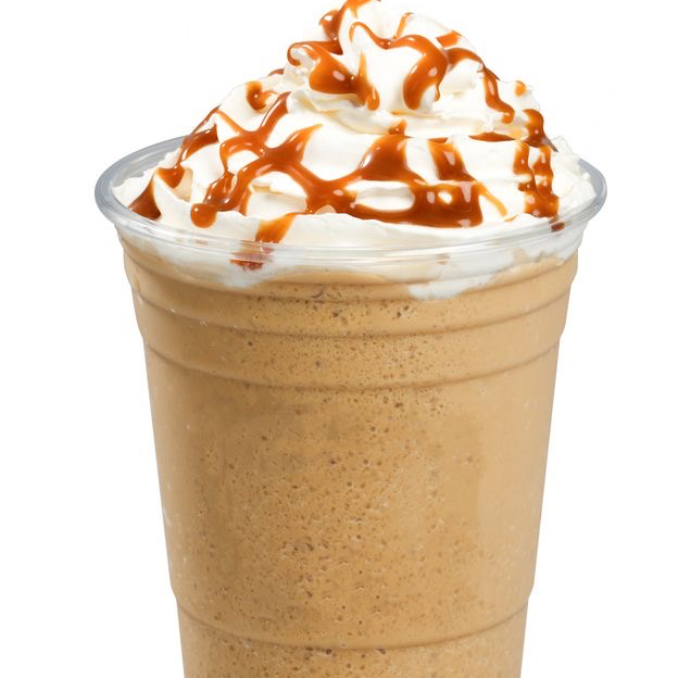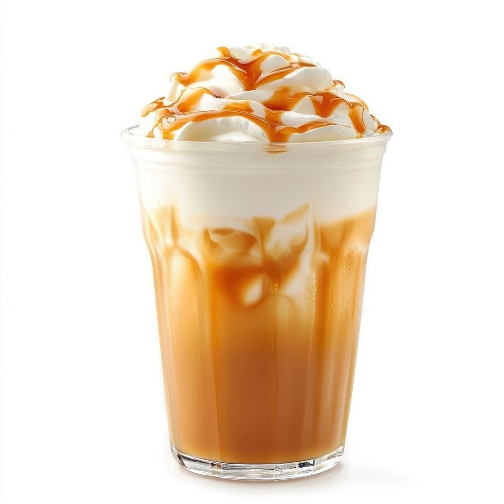 Bebida fria y cremosa preparada con cafe, leche y jarabe de caramelo..