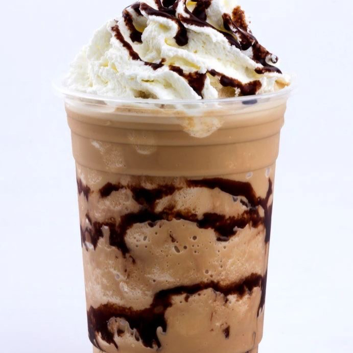 Bebida fria y cremosa preparada con cafe, chocolate, leche y hielo.