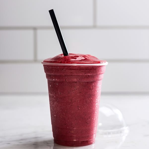 Bebida fria preparada con arandano y fruta natural, de sabor dulce y textura cremosa.