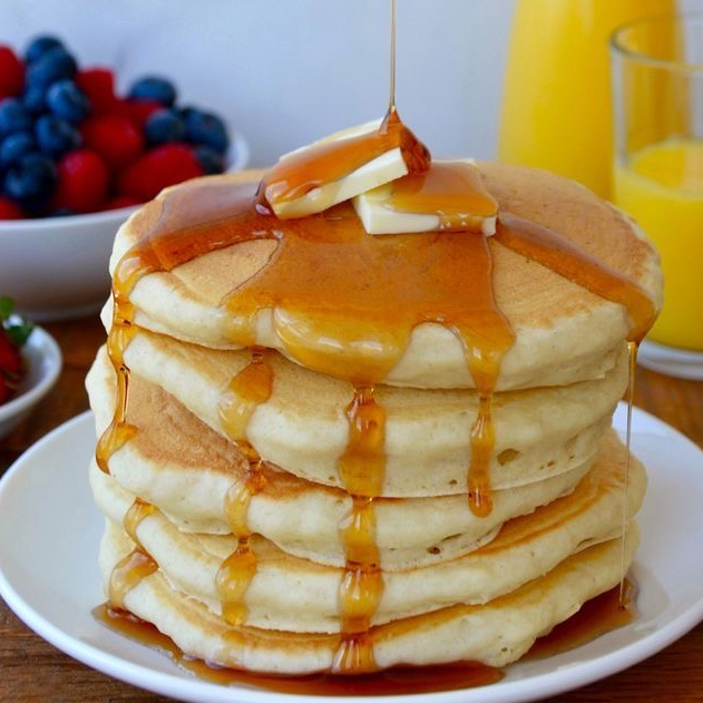 Hot cakes esponjosos servidos con fruta fresca.
