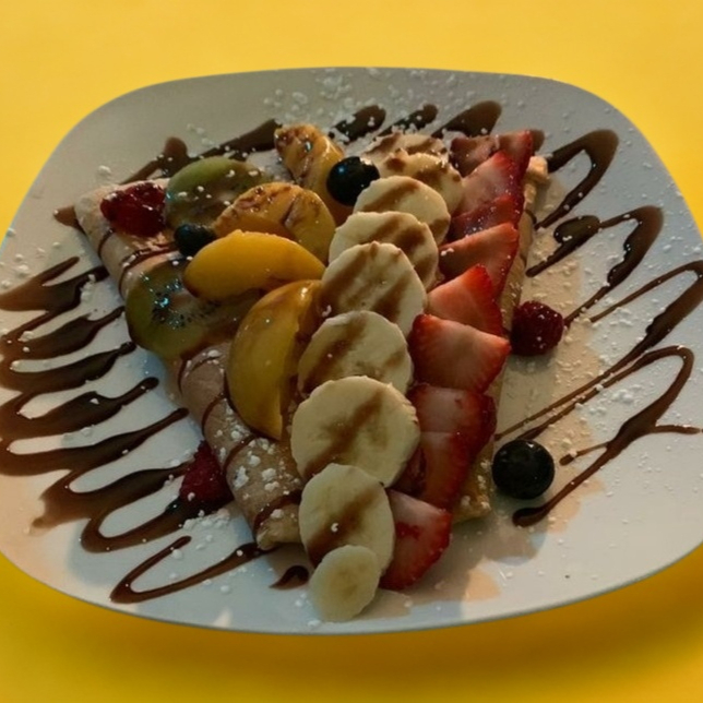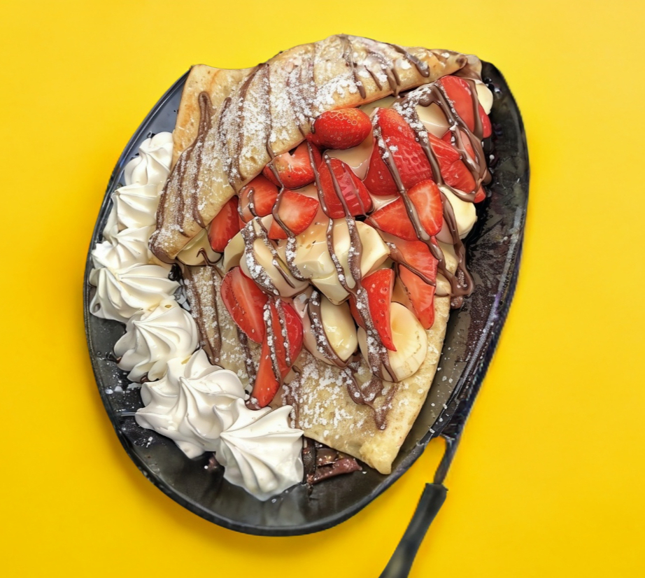 Deliciosa crepa 40cm acompañada con su dulce untable fruta fresca y un toping de su elección