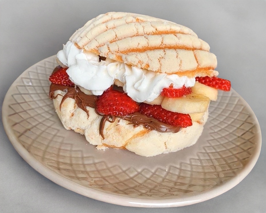 Delicioso concha rellena con un untable una fruta un topping con crema batida