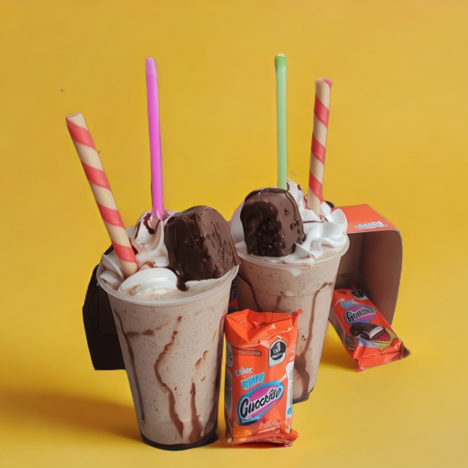 Helaborada con base helado y leche decorado el vaso con chocolates y crema batida