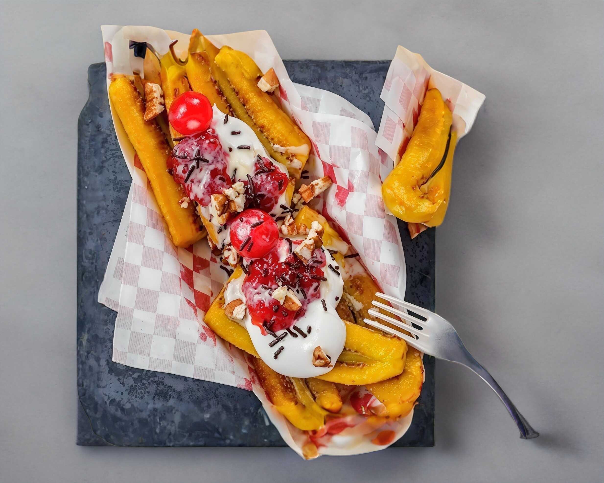 ricos platanos fritos acompañados con crema con deliciosa mermelada de fresa lechera y con dulce granillo de chocolate turin