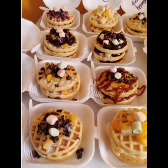Deliciosos mini wafles 3 piezas acompañados de la fruta untable y 2 topping a tu eleccion