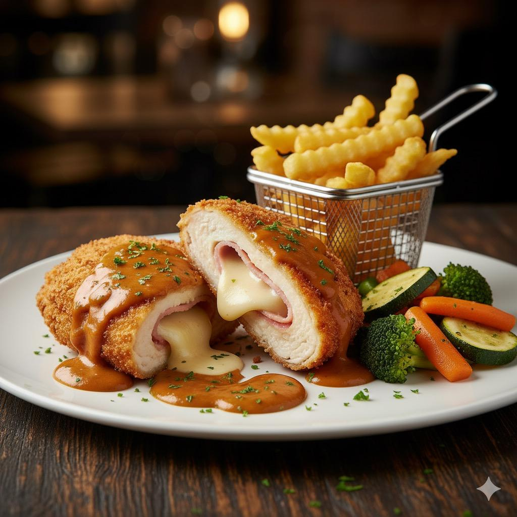 Pechuga de pollo rellena de jamon y queso. Bañada en salsa chipotle Acompañada de verduras al vapor y papas a la francesa