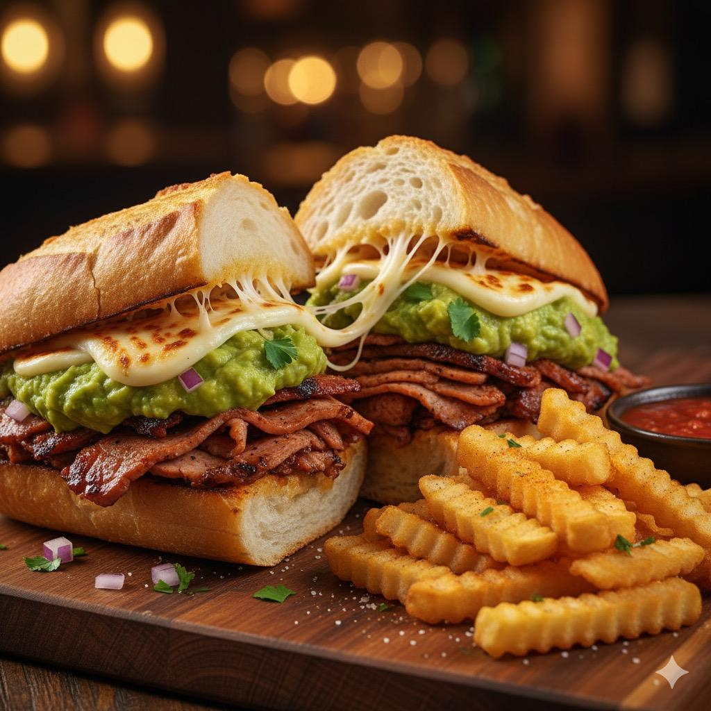 Baguette con tiras de pollo empanizado, tocino, queso manchego, aguacate, lechuga, jitomate y papas.