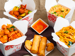 5 Guisados en China Box (200 gr cada uno) + 5 Guarniciones (250 gr cada una) en China Box + 5 Rollos Primavera 5 Galletas de la Suerte