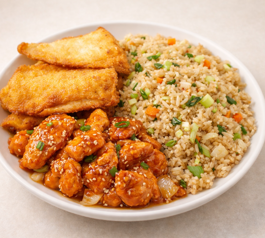 1 Guarnición (250 g) más 1 guisado a escoger (200 g) más vegetales al wok (250 g) más galleta de la suerte.