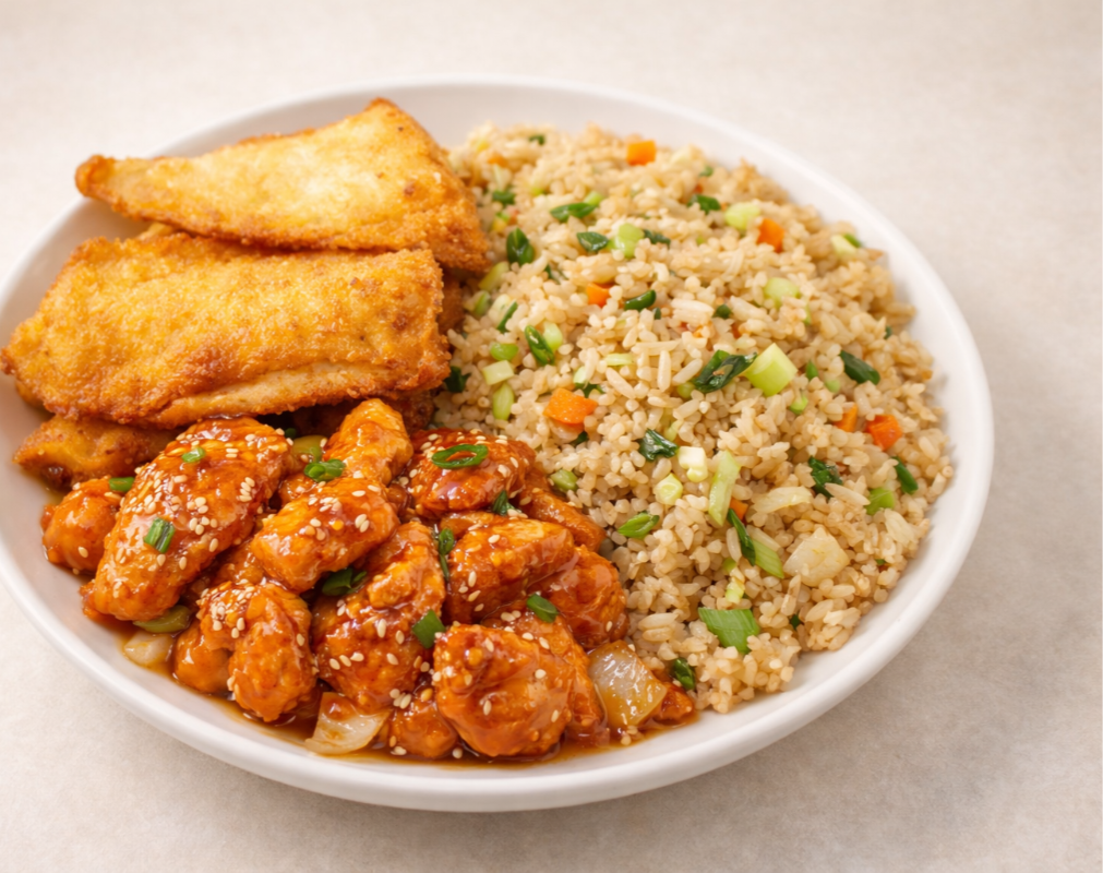 1 Guarnición (250gr) + 1 Guisado a Escoger (200 gr) + Vegetales al Wok (250 gr) + Galleta de la Suerte